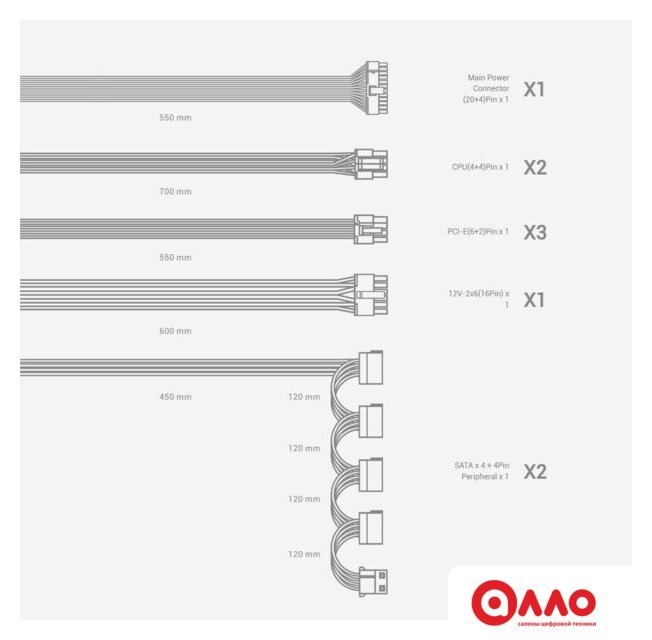 ATX 650 Вт, активная PFC, золотой сертификат, вентилятор 1x120 мм, модульные кабели, 1x 12В 54А, 1x PCIe Gen5