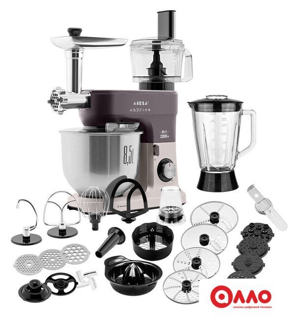 850 Вт, планетарное смешивание, объем чаши: 8.5 л, терки, измельчитель, мясорубка, соковыжималка, блендер